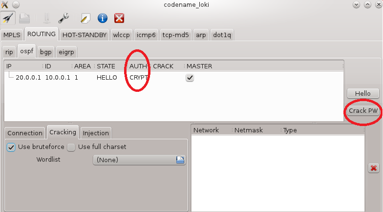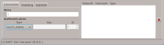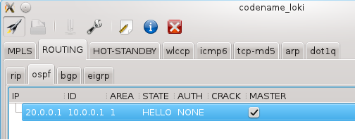 Firstly we'll send an empty Hello packet and see what happens. To do so we set "area" to "1" and Authentication type to "AUTH_NONE". We start sending packets by clicking "Hello".