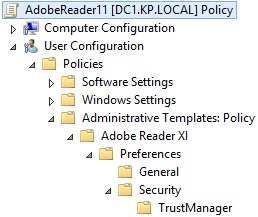 They are provided in the standard GPO template format used since Windows 2008. There are two files: reader11.admx and reader11.adml. The files need to copied to different locations depending on whether you use local or central GPO stores.