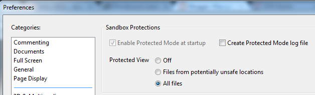 Computer Level>AR>Preferences>Startup: Enable Protected Mode at Startup