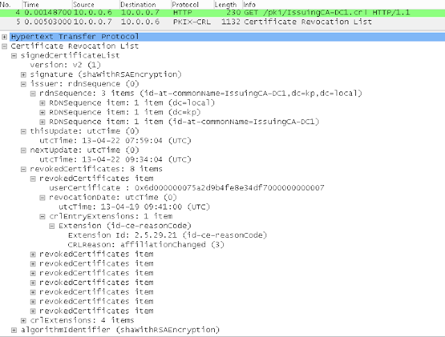 WireShark decodes the PKIX-CRL. We can see all CRL extensions directly in the packet.