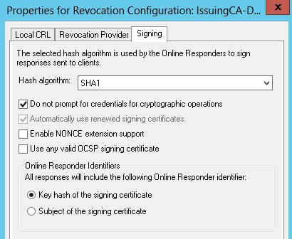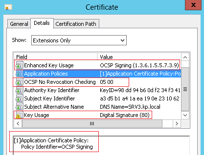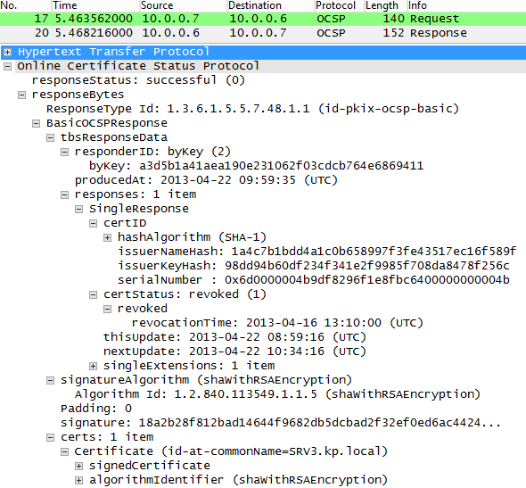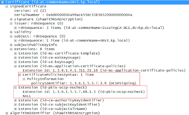 To prevent spoofing attacks, the response is signed by the responder. In order to validate the signature, certificate containing public key of the responder is returned. This could lead to a problem whereby OCSP signing certificate revocation would be checked leading to a "verification loop". According to the RFC's 2560 section 4.2.2.2.1 there are three ways of overcoming this issue. Microsoft CA implementation uses special extension "id-pkix-ocsp-nochek". This extention tells the requester not to validate status of the OCSP signing certificate. The risk of the certificate being misused is mitigated by using very short certificate validity periods.